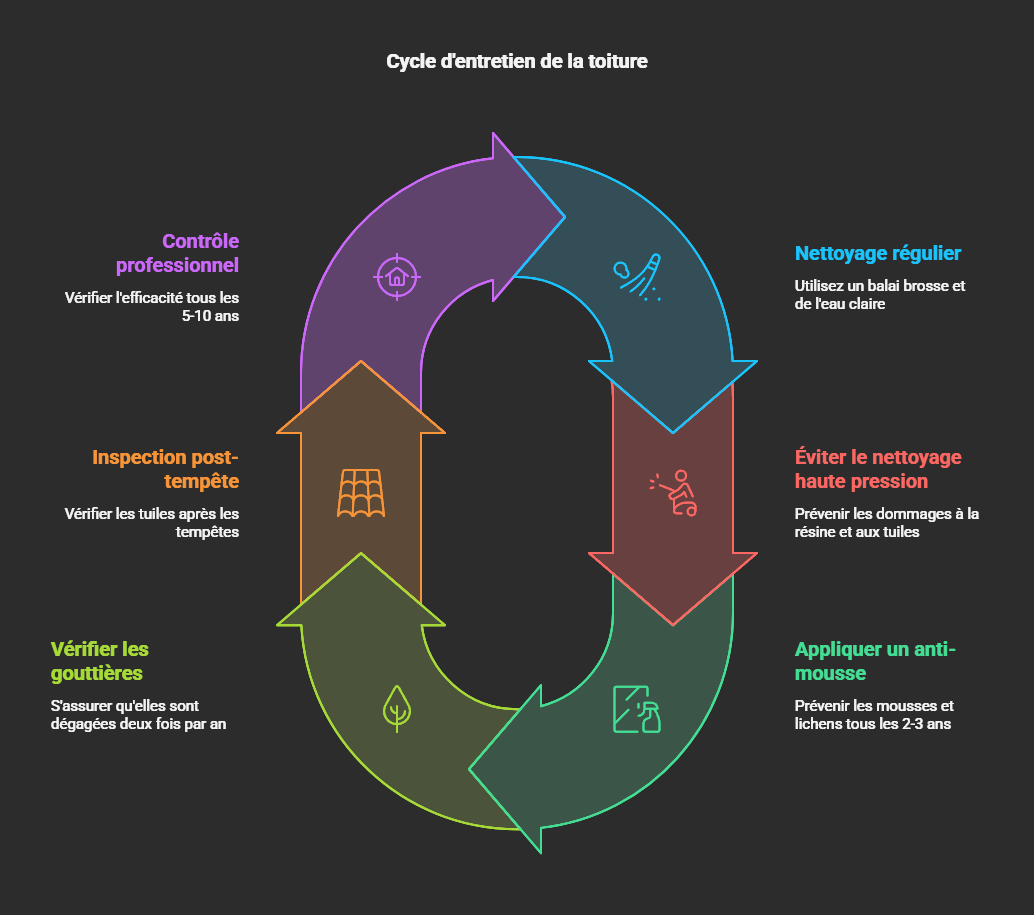 Une toiture propre et saine est indispensable pour assurer une bonne accroche et une durabilité optimale du traitement.