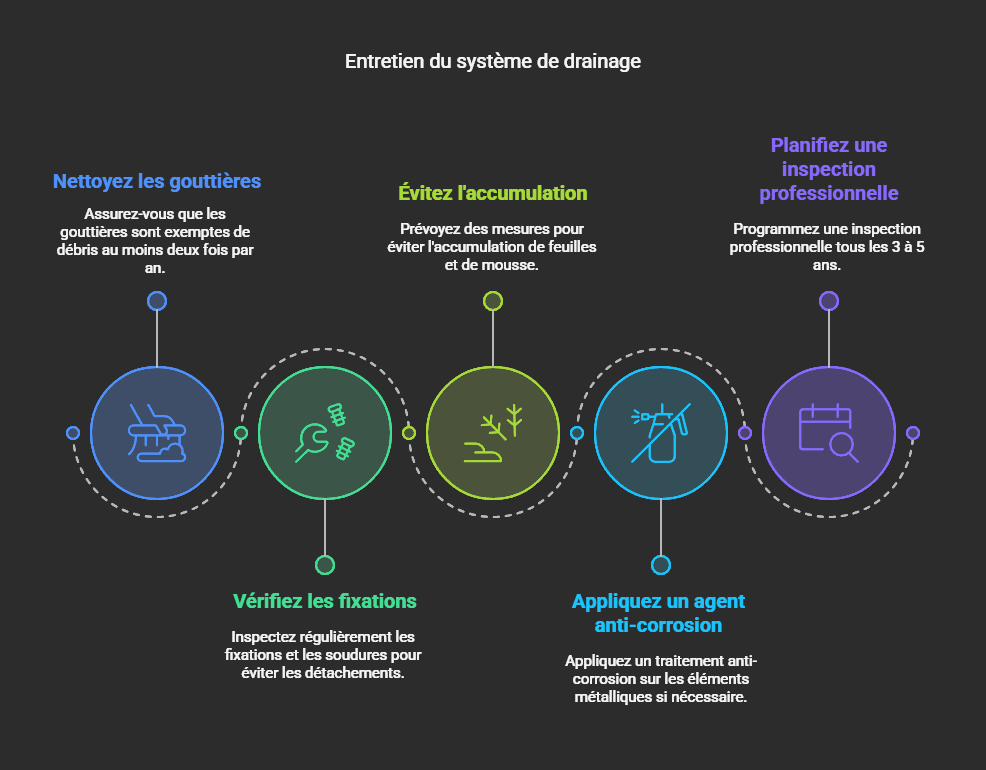 - Assurer l’évacuation des eaux de pluie : Évite les stagnations d’eau et limite les risques d’infiltrations.